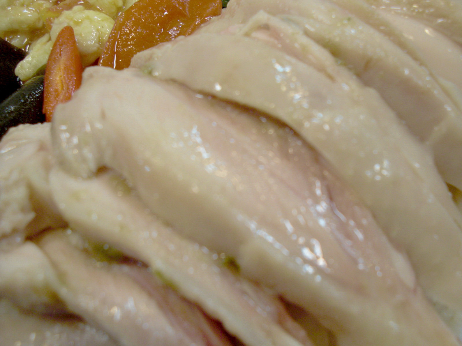 本店雞肉則嚴選CAS認証雞腿肉,加入蔥薑等香料,以小火燜煮,使肉質鮮嫩爽口。為了讓顧客方便食用,在冰鎮後去骨,再淋上本店特製蔥薑醬,再沾上特製招牌辣椒醬及醬油風味更佳。
